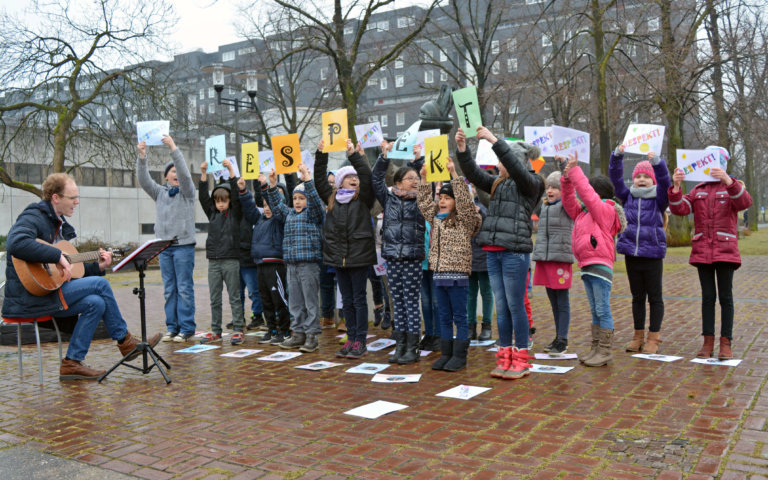 Ein starkes Zeichen gegen Rassismus hat heute die Klasse 3b der Bonifatiusschule aus Marl-Brassert auf dem Creiler Platz gesetzt. Trotz Regen und Wind sang sie im Rahmen der Aktion „#bunterleuchtet“…