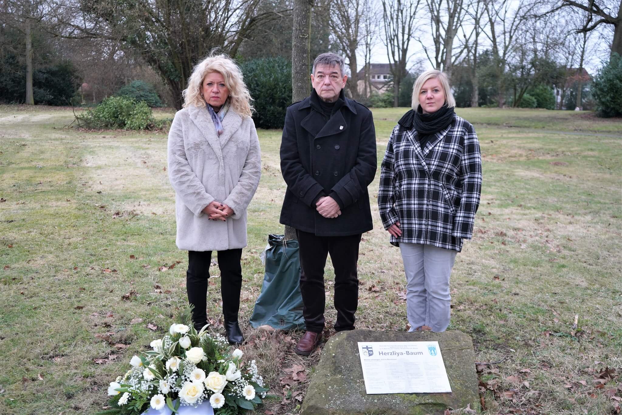 Gestern habe ich als Bürgermeister gemeinsam mit der stellvertretenden Bürgermeisterin Petra Kläsener und Maresa Kallmeier, Vorsitzende des AGVT-Ausschusses der Opfer des Holocaust gedacht. Am Herzliya-Baum im Friedenspark legten wir ein Blumengesteck nieder. Dieser Baum ist ein besonderer Ort der Erinnerung. Und das Gedenken an die Opfer des Holocaust ist unsere gesellschaftliche Pflicht. Wir dürfen sie nicht vergessen – niemals! Foto: Pressestelle Stadt Marl.